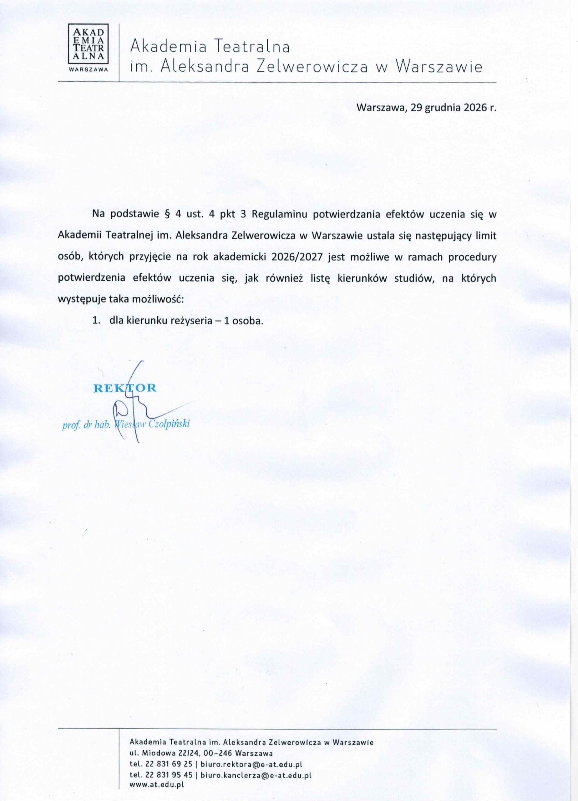 1) dokumenty poświadczające uzyskanie wykształcenia średniego (opisane w par. 5 ust 1 lit a-g Regulaminu potwierdzania efektów uczenia się w Akademii Teatralnej im. A. Zelwerowicza w Warszawie), i co najmniej 5 lat doświadczenia zawodowego – w przypadku ubiegania się o przyjęcie na studia pierwszego stopnia lub jednolite studia magisterskie;