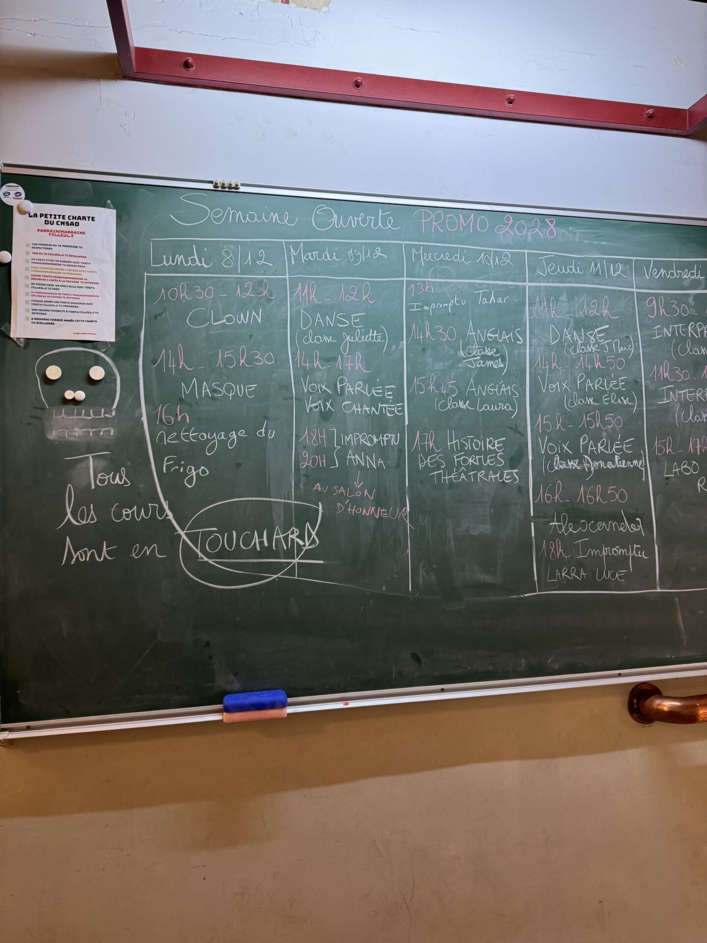 W trakcie trzydniowego pobytu odbyłem spotkania z dyrektorem pedagogicznym uczelni, szefową administracji, kierownikiem produkcji teatru oraz z dyrektorką artystyczną teatru i uczelni, Panią Catherine Marnas. Uczestniczyłem również w konferencji prasowej zapowiadającej przyszły sezon teatralny, w premierze przedstawienia dyplomowego studentów III roku pt. „Sceny z dorosłości” na postawie powieści „Młodzik” Fiodora Dostojewskiego w reżyserii Sylvaina Creuzevaulta, oraz mogłem przyglądać się próbie do nowego spektaklu „A bright room called day” Tonyego Kushnera w reżyserii Catherina Marnas. Zorganizowano mi również spotkanie ze studentami, profesorami oraz Panem Tomem Lintonem z niezależnej grupy teatralnej Collectif Oso.